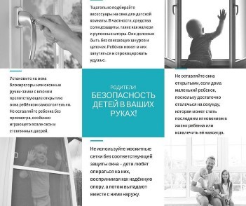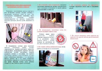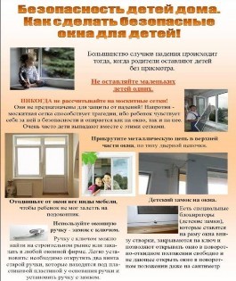 на противомоскитную сетку, выпадали из окна вместе с ней. При этом подавляющее большинство падений происходили из-за недостатка контроля взрослыми за поведением детей, рассеянностью родных и близких, забывающих закрывать окна, отсутствие на окнах блокираторов или оконных ручек-замков, неправильной расстановкой мебели, дающей возможность детям самостоятельно забираться на подоконники, и наличие москитных сеток, создающих иллюзию закрытого окна.